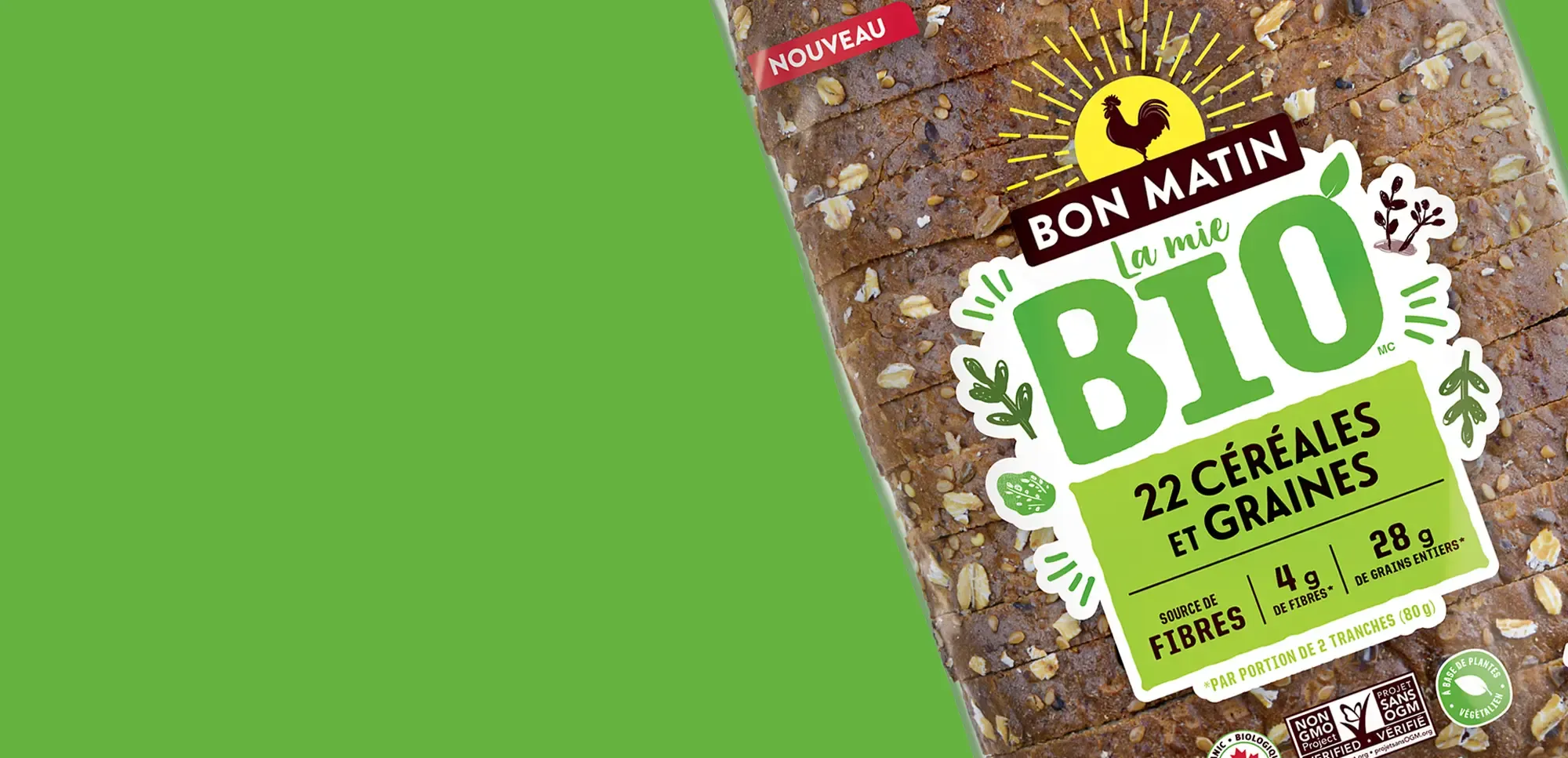 Nous louons BrandBourg pour la plateforme distinctive qu’ils ont créée pour Bon Matin BIO. Ils ont su faire appel à leur compréhension très fine de la catégorie, du consommateur et de la marque pour en arriver à un design qui s’appuie sur la franchise Bon Matin tout en ayant un attrait distinctif en linéaire afin de rejoindre le consommateur bio.